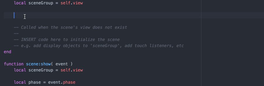 The autocomplete system lets you view and insert possible completions in the editor using tab or enter. By default, the autocomplete system will look through the current open file for strings that match what you're starting to type.